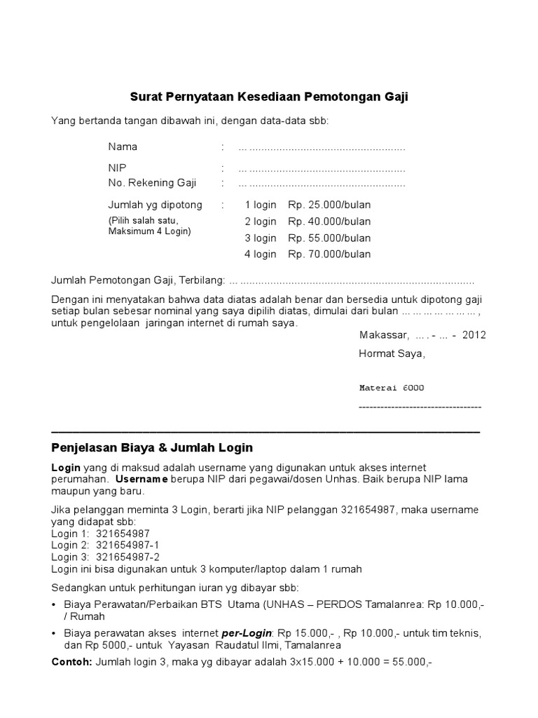 Surat Pernyataan Kesediaan Pemotongan Gaji